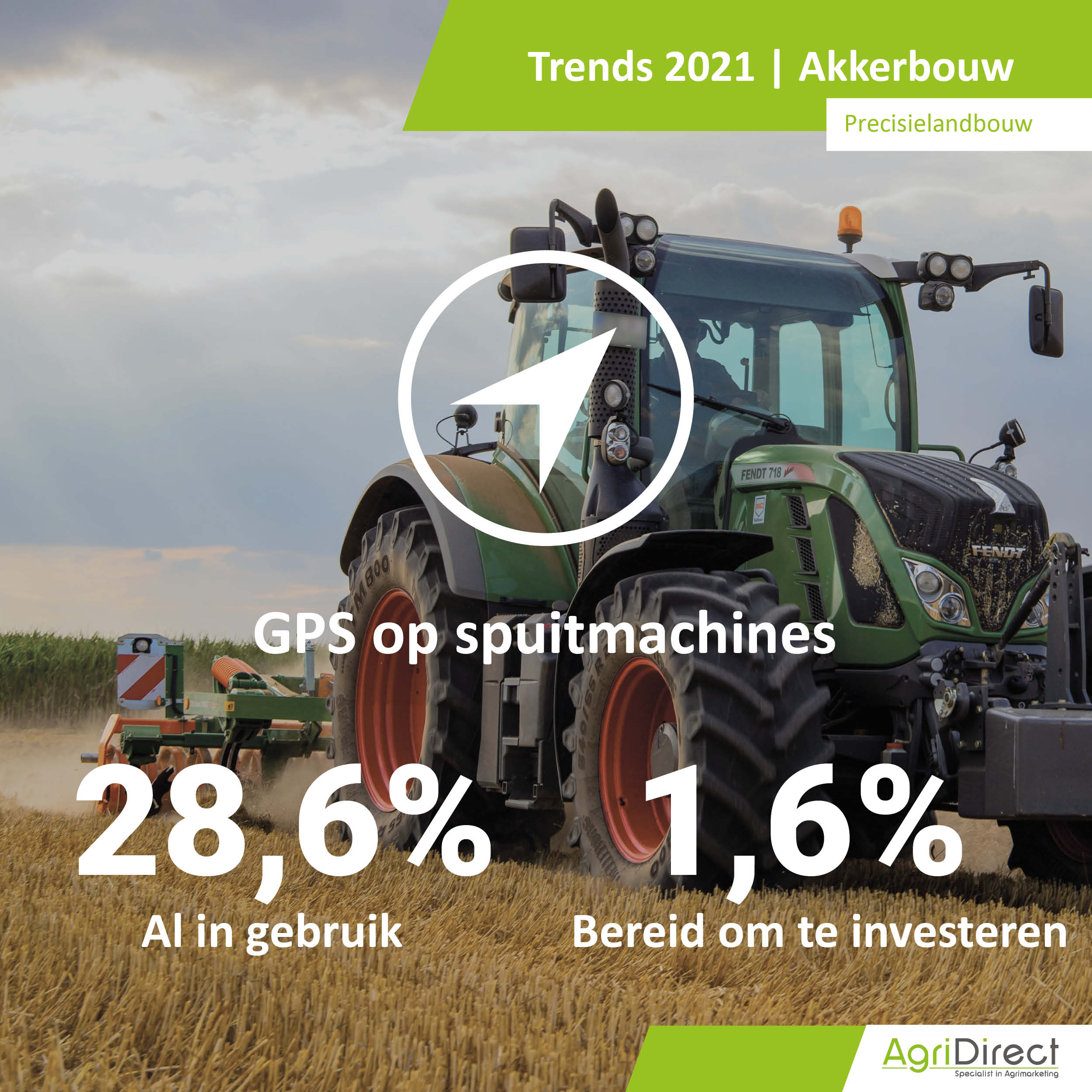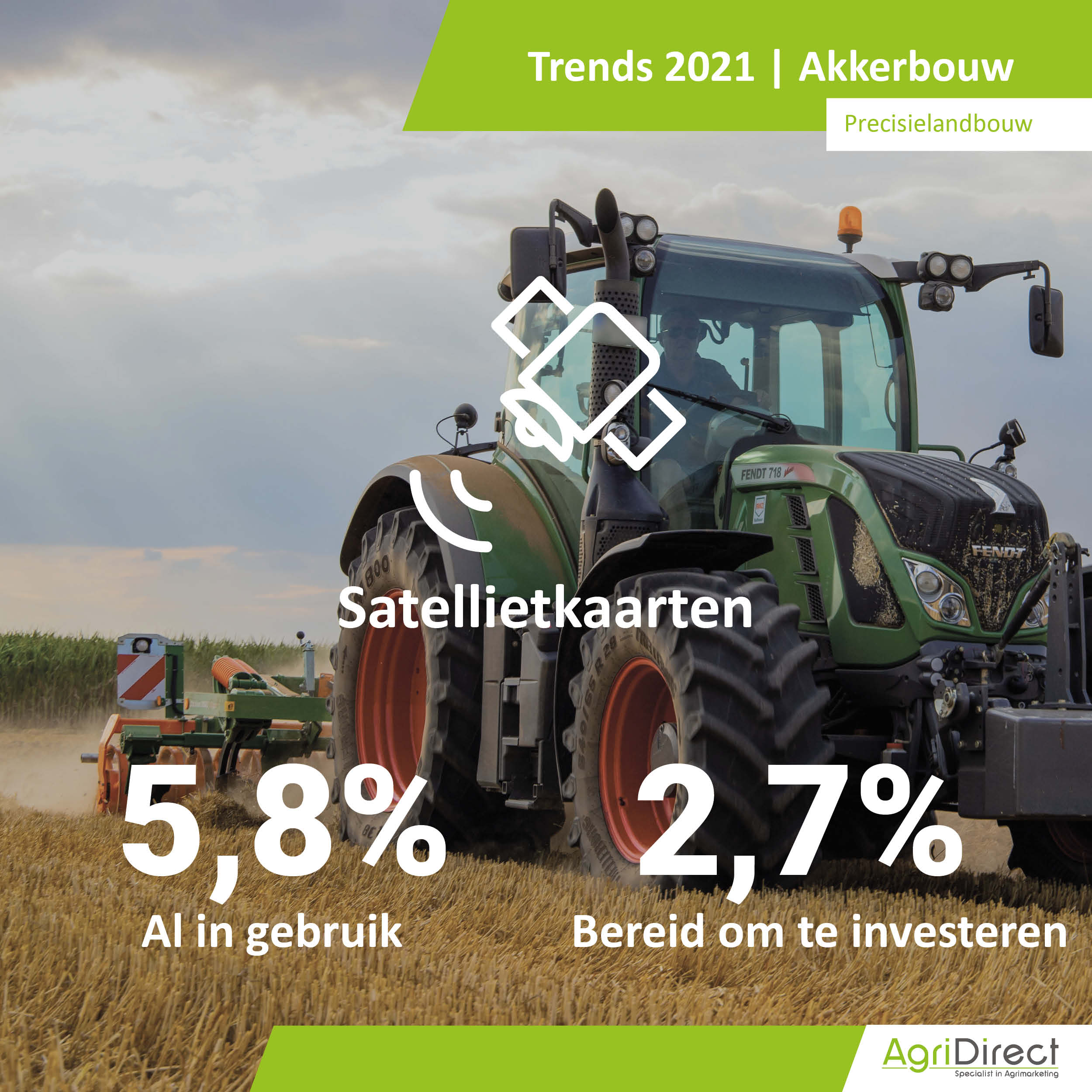 Het feit dat 30% van de ondervraagden bereid is om te switchen in de toekomst, zegt niet dat zij direct gaan investeren in een tractor. Dat blijkt uit de investeringspercentages van akkerbouwers in een nieuwe óf gebruikte tractor: